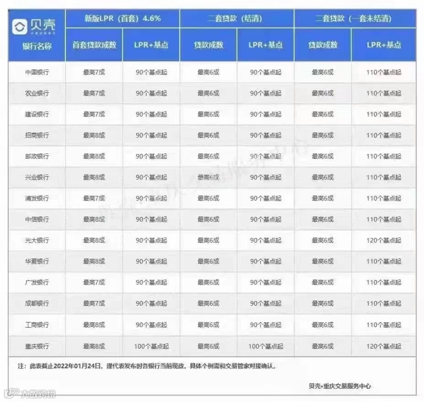 根据贝壳找房平台工作人员提供的一份重庆当地银行贷款情况表,目前,招商银行、兴业银行、中信银行、光大银行、华夏银行、工商银行、重庆银行首套房贷首付比例最低均为20%。