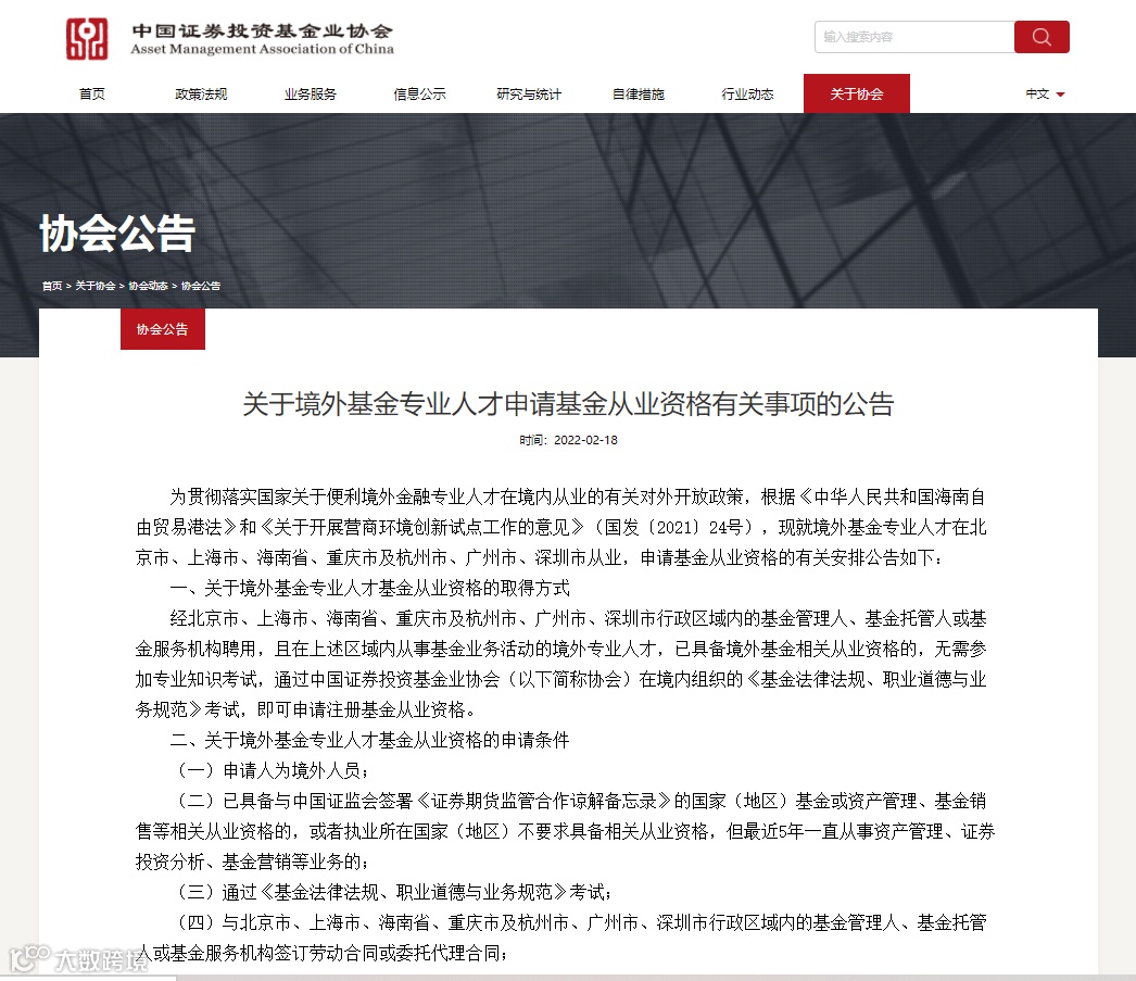 2月18日,中国证券投资基金业协会发布《关于境外基金专业人才申请基金从业资格有关事项的公告》。