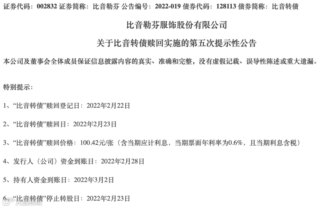比音勒芬称,本次可转债赎回价格可能与比音转债的市场价格存在较大差异,特别提醒持有人在2022年2月22日之前或当日完成交易或转股,否则可能面临较大投资损失。