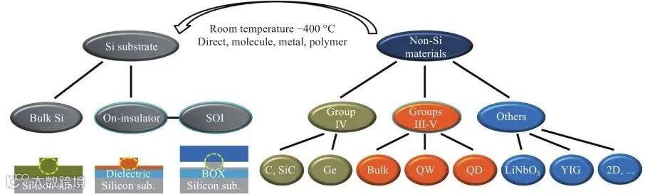 硅基异质集成的晶圆键合技术将功能性的非硅薄膜材料转移到硅晶圆上,以弥补硅材料本身缺少或较弱的光电性能。如图1所示,在过去的15年中,它已经发展成为具有许多技术分支的一个新技术领域,其中硅基三五族复合半导体的异质集成是最成熟的一种。