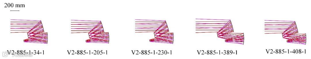 第二个设计实例是一个焦距为450 mm,视场角大小为4°× 4°,F数为9,工作波长为可见光。经过高性能计算平台35.3小时的计算,共输出了59个自由曲面系统,平均每个系统设计耗时约35.9分钟,所有系统的AVG WFE RMS都小于0.075λ(λ = 587.6 nm)。输出的部分设计结果如图3所示。