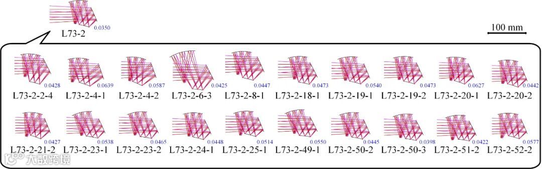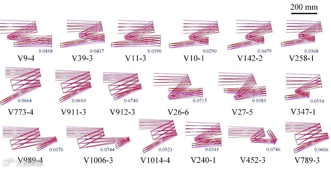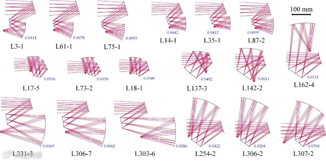 本研究首先利用所提出的方法设计了自由曲面离轴三反成像系统,其焦距为50 mm,视场角大小为8°× 6°,F数为1.8,工作波长为长波红外。该计算任务在清华大学高性能计算平台上完成。经过41.8小时的计算,共输出了127个自由曲面系统,平均每个系统设计耗时19.7分钟。如果独占足够的计算资源,整体的计算时间将会进一步大幅缩短。最终输出的计算结果中,所有系统波像差RMS的平均值(AVG WFE RMS)都小于0.075λ(λ = 10 μm),可以认为它们的像质接近或达到了衍射极限。输出的部分设计结果如图1所示,各系统旁的数字表示该系统的AVG WFE RMS值(下同)。