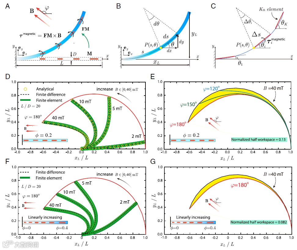 MSCR通常包括一个能实现磁响应的远端部分和一个非磁化的主体,该远端可以通过调节致动磁场而主动弯曲,该非磁化的主体可以通过控制系统连接到MSCR近端的电动机,从而实现前进或后退。在典型的微创治疗中,外科医生远程控制马达以将MSCR推进到需要主动转向的位置,例如在血管分支(图1B)或病变组织(图1C)。在这些位置,外科医生需要远程施加磁场以弯曲MSCR的远端,以便MSCR的末端执行器到达所需位置。此后,外科医生进一步推动或操作由致动磁场主动控制的MSCR。显而易见,MSCR的可操纵性在很大程度上取决于其工作空间(其末端执行器可达到的位置集)。而更大的工作空间能在微创治疗中为MSCR带来更高的操纵性。现有的MSCR大多是通过将一个或多个永久磁铁嵌入MSCR的远端部分制成的。最近,一种新型的MSCR则是通过将硬磁颗粒均匀地分散在弹性纤维中(图1D)。但是,具有嵌入式磁体和均匀分布的硬磁粒子的MSCR的工作空间仍然受到限制,这主要是由于缺少MSCR的高效设计和优化工具。实际上,MSCR的现有设计在很大程度上依赖于试验性的反复试验或数值模拟,这对于具有大量参数的MSCR设计或优化而言并不理想。因此,能够最大化MSCR工作空间的有效设计策略仍然是一个重要但尚未解决的挑战。