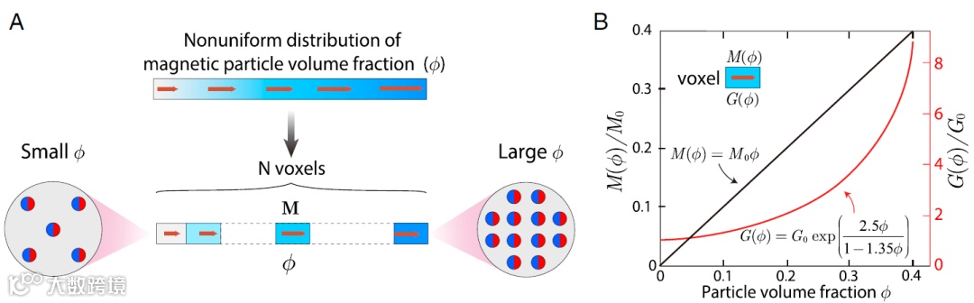 图2. 通过对远端部分的磁化和刚度模式进行编程来设计 MSCR。(A) 通过调整其磁性粒子体积分数 ϕ,每个体素都使用特定的剩磁M进行编码。所有体素的剩磁方向是沿着指向远端的轴向。(B) MSCR 的归一化磁化强度 M(ϕ)=M0(左,黑色)和剪切模量 G(ϕ)=G0(右,红色)作为粒子体积分数ϕ的函数