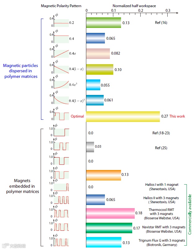 图5. 比较优化的 MSCR、最先进的MSCR和带有嵌入式磁铁的导丝/导管之间的标准化半工作空间。优化后的MSCR的最大归一化半工作空间为0.27。
