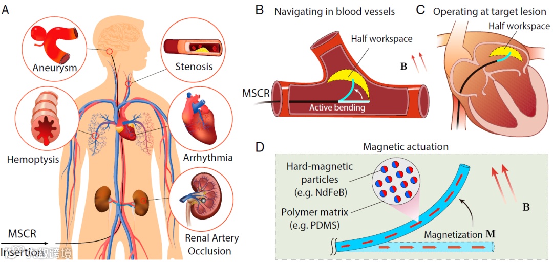 图1. 用于微创治疗的 MSCR。(A) 人体难以触及的区域的心血管疾病,MSCR 可以在这些区域发挥效能。(B) 在复杂血管中导航的 MSCR 主动弯曲的示意图。工作空间被定义为 MSCR 的末端执行器通过调整致动磁场可达到的位置区域。(C) 在心房颤动消融病变组织中操作 MSCR 的示意图。(D) MSCR 远端部分的示意图,其中硬磁颗粒(例如 NdFeB)分散在聚合物基质(例如硅树脂)中。