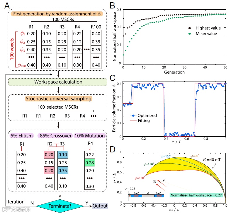 鉴于此,麻省理工学院赵选贺团队创造性地提出一种进化设计策略,通过集成理论模型和遗传算法来确定MSCR内的最佳磁化强度和刚度模式(图2A),从而最大化MSCR的工作空间。这意味着优化的MSCR在微创治疗中具有卓越的可操纵性。这种设计和优化方法还可以轻松地纳入其他设计参数,这为设计和优化未来的磁性软机器人和执行器提供了强大而有效的工具。该研究以题为“Evolutionary design of magnetic soft continuum robots”的论文发表在最新一期《PNAS》上。