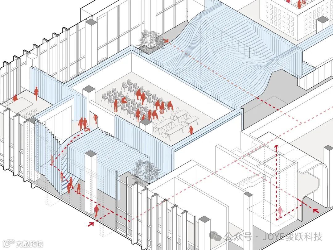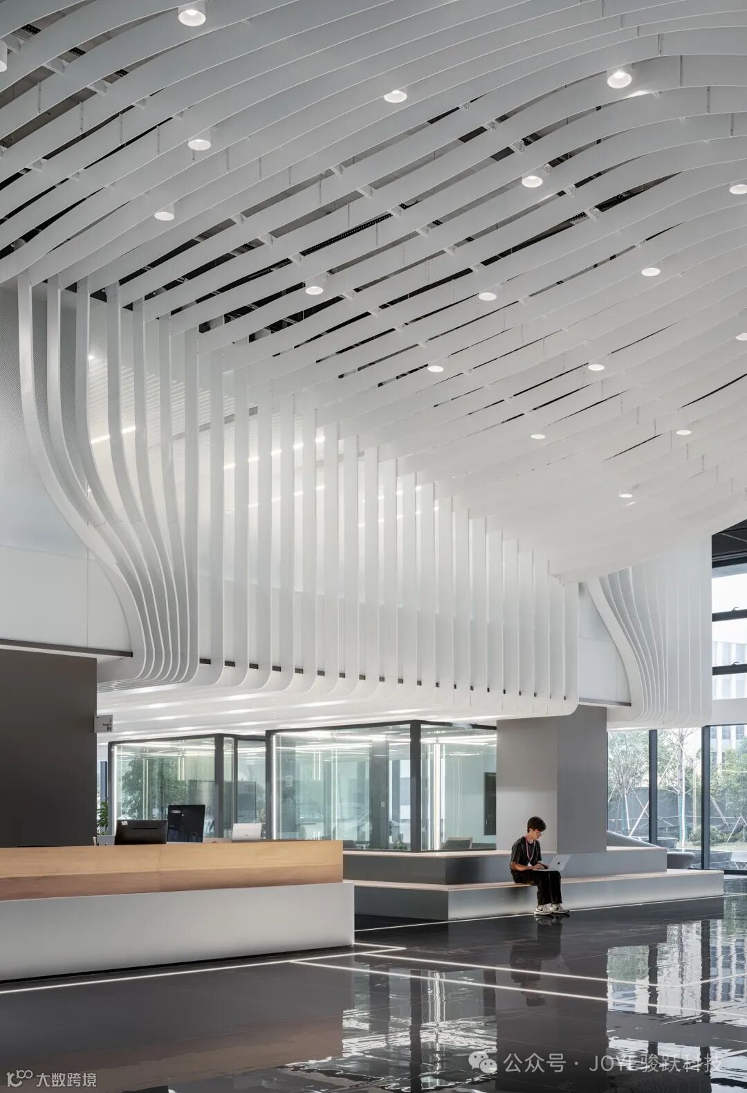 入口大厅以一座两层楼高的中庭为核心,通过悬挂的卷云状设计,将中庭两侧的展览区与会议区自然地连接起来。这些仿佛从天而降的白云,以其纯净的颜色和轻盈的姿态,缓缓自屋顶延伸下来,如同细腻的面纱一般轻柔飘动,共同构建了一个既宏伟又温馨的标志性空间形象。