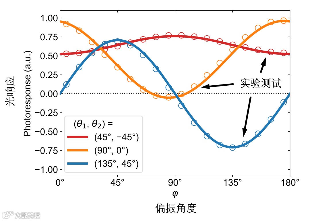 测试结果(点)和计算结果(实线)。测得的偏振比值分别为1.5(红色)、-12(黄色)和-1(蓝色). 其他偏振比的结果详见原文