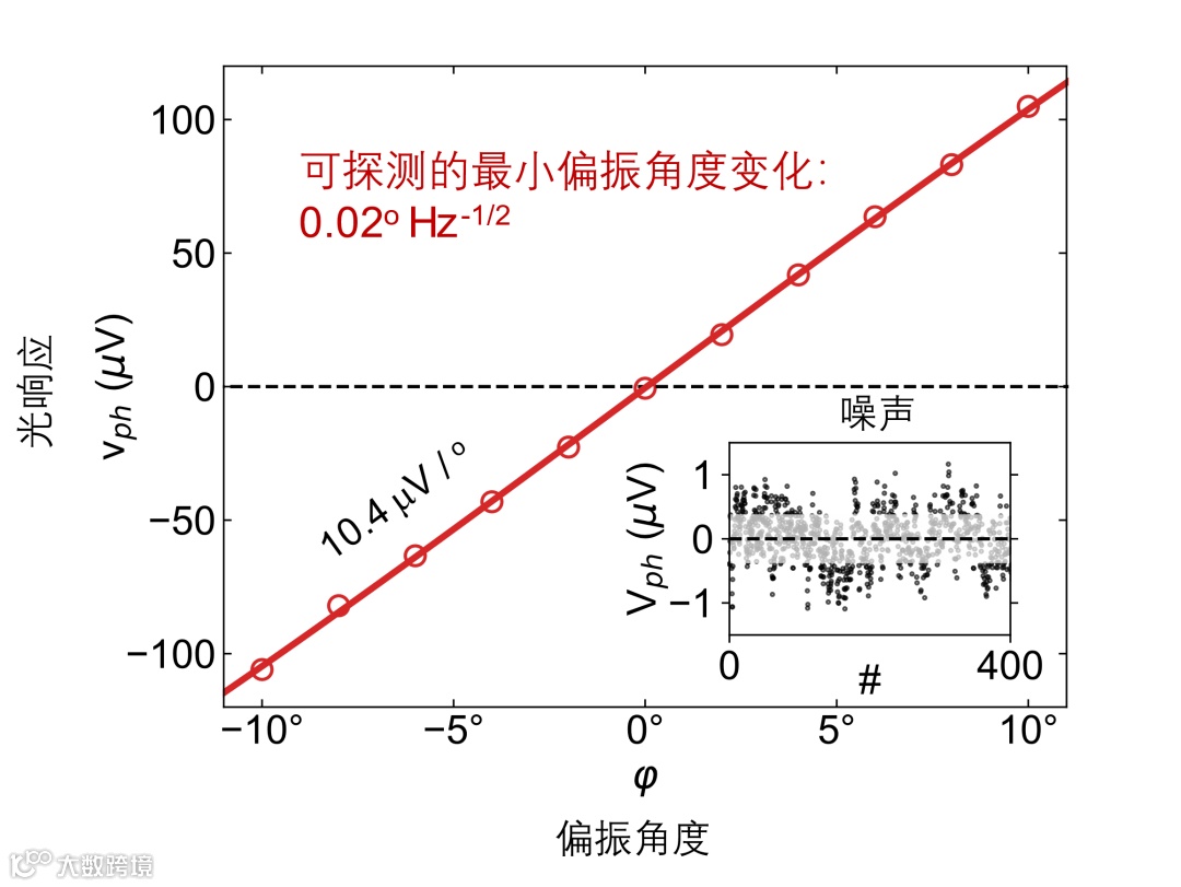 多层石墨烯作为一种半金属,除了其非局域定向的光响应可以被我们利用实现大范围可调的偏振比之外,在零偏压下其噪声水平也是很低的。研究人员对他们的器件进行了测试,发现最小可以测到0.02o Hz-1/2的偏振角度变化。