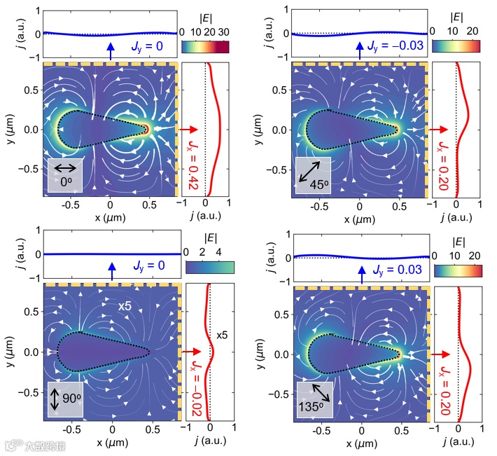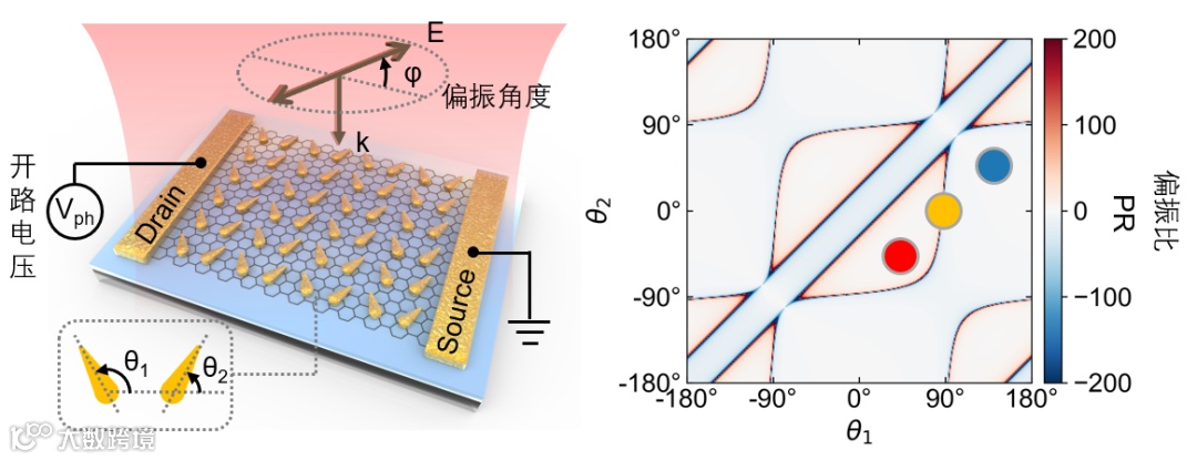 (2)基于上述的理论模型,研究人员可以方便地对器件的偏振响应进行设计。在这个工作中,研究人员通过控制纳米天线放置的角度(θ1,θ2),来实现偏振比的值在1→∞/-∞→-1范围内遍历。