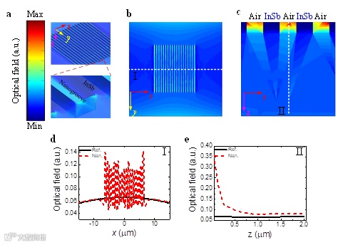 为了进一步增强毫米及太赫兹波段的表面等离子激发,本文引入了基于探测半导体自身的纳米沟槽结构(图1)。该结构直接嵌入在探测敏感元InSb之中,能够更加有效的激发表面等离子体(图2),从而诱导产生更多的非平衡载流子,实现高灵敏度探测。