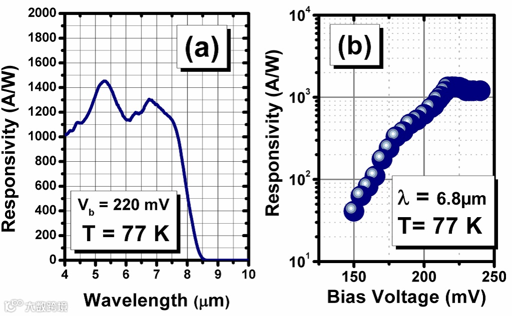该器件的1 / e截止波长为8.0μm。在77K,施加90mV的偏压会出现单位光学增益,对应的暗电流密度为3.2×10-7A/cm2(见图三)。进一步的,在此温度下,当施加220mV的偏压,光学增益可以达到276的饱和值,此时在峰值探测波长6.8μm处,设备的响应率为1284A/W(见图四a)。
