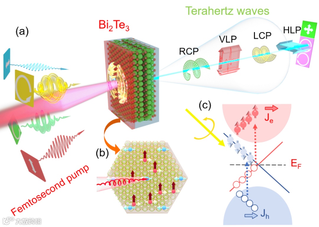 图1 圆偏振太赫兹辐射的产生与调控原理示意图。(a) 太赫兹辐射的偏振特性可通过飞秒激光的偏振态来进行操控;(b) 手性偏振光激发相应自旋电子,形成自旋电流;(c) 圆偏振光泵浦激发电子跃迁示意图