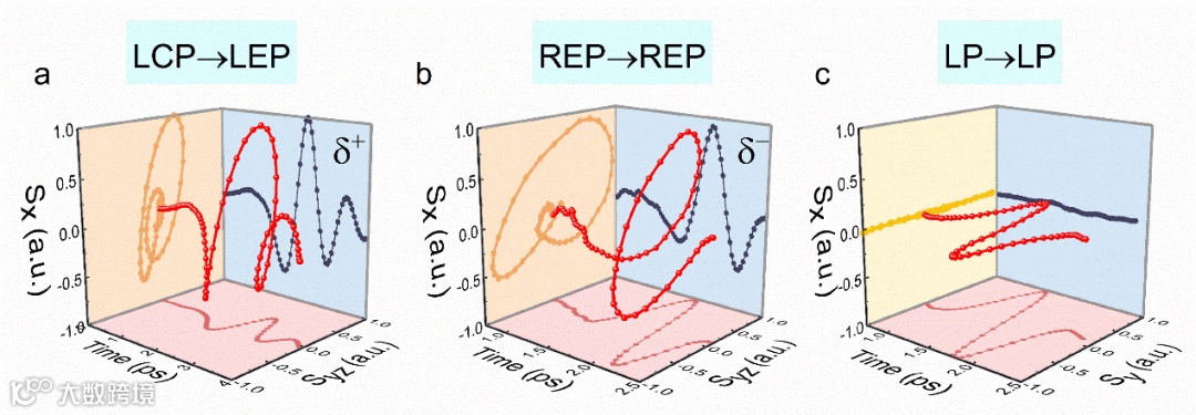 图3 任意偏振太赫兹辐射的调控。(a) 左旋圆偏振太赫兹波产生结果;(b) 右旋圆偏振太赫兹波产生结果;(c) 线偏振太赫兹波产生结果