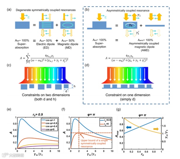 高指数全介质光子结构,能够支持多极Mie共振或导模,已被提出作为替代等离子体结构的宽带光捕获。通过将减反射纳米结构放置在活性材料上或直接构建活性材料,实现了高效的吸收增强;然而,总厚度大于工作波长。为了解决厚度与吸收之间的矛盾,最近提出了超薄光子超吸收器。由于反射镜对称光子结构中的一个模式有一个基本的上吸收极限(50%),因此利用两个对称相反的临界耦合简并模式(通常是电模和磁模)来促进吸收;然而,基于这种策略的平面光子技术无法实现吸收带宽的潜在扩展,因为它对这两种谐振模式的简并要求很严格。到目前为止,宽带光捕获在亚波长平面光子学中仍然是一个难以捉摸的挑战。