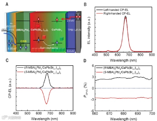 自旋LED的结构和原理如图一所示。研究者首先使用CISS / CsPbI3 NC异质结构实现了自旋LED的圆偏振电致发光,效率为±0.25%。接下来他们引入CISS / CsPbBr3结构,图三(A),并在偏压下生成了混合相CsPb(Br0.1I0.9)3纳米晶,将自旋LED的圆偏振电致发光率提高到了2.6%。