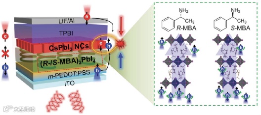 商业自旋电子学的最大障碍之一是设定电子自旋。在传统的光电材料中,控制自旋和电荷通常需要外加电场和磁场。比如在目前的spin-LED中,载流子由外加电场注入,并在外加磁场或铁磁接触下产生自旋极化,从而实现圆偏振的电致发光。因此这种器件同时需要半导体器件,铁磁材料或磁场设备,这不仅造价昂贵而且限制了器件的小型化。