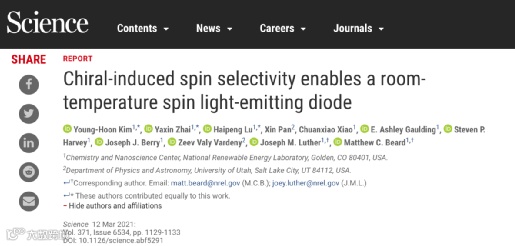 [1] Y.-H. Kim†, Y. Zhai †, H. Lu †, X. Pan, E. A. Gaulding, S. P. Harvey, L. M. Wheeler, J.J. Berry, Z. Valy Vardeny, M. C. Beard, J. M. Luther, "Chiral Induced SpinSelectivity enabling a room temperature Spin-LED", Science, 371,1129(2021).