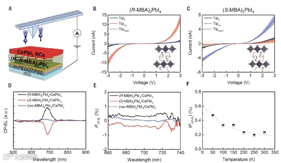 研究者首先通过含可磁化探针原子力显微镜测量证实,二维手性铅碘钙钛矿薄膜能够对不同自旋的载流子进行有效筛选,即通过手性诱导自旋极化(CISS)效应实现室温下的自旋极化。同时,改变手性钙钛矿的手性可以实现对载流子自旋极化的高效调控(即左旋/右旋分别产生自旋向上/自旋向下的载流子)。实验结果表明通过二维手性金属卤化物钙钛矿薄膜可产生超过80%的自旋极化电流(B和C)。基于此,他们进一步提出通过二维手性钙钛矿作为LED器件的空穴传输层来注入自旋极化的空穴,使得电子空穴复合后发出圆偏振光,从而在不通过磁场及铁磁材料的条件下实现室温自旋LED。