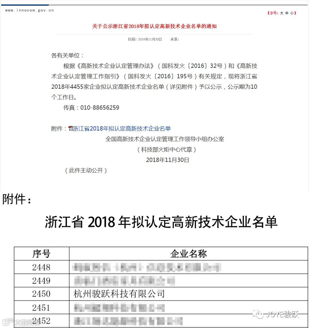 2018年11月30日,根据《高新技术企业认定管理办法》(国科发火〔2016〕32号)和《高新技术企业认定管理工作指引》(国科发火〔2016〕195号)有关规定浙江省2018年第二批高新技术企业名单正式公布。经审查,JOYE成功通过“国家高新技术企业”认定!这是对JOYE多年努力的一种肯定,也是我们新的起点~