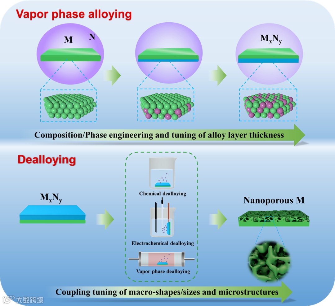 气相合金化-脱合金制备具有金属基底支撑纳米多孔金属的示意图