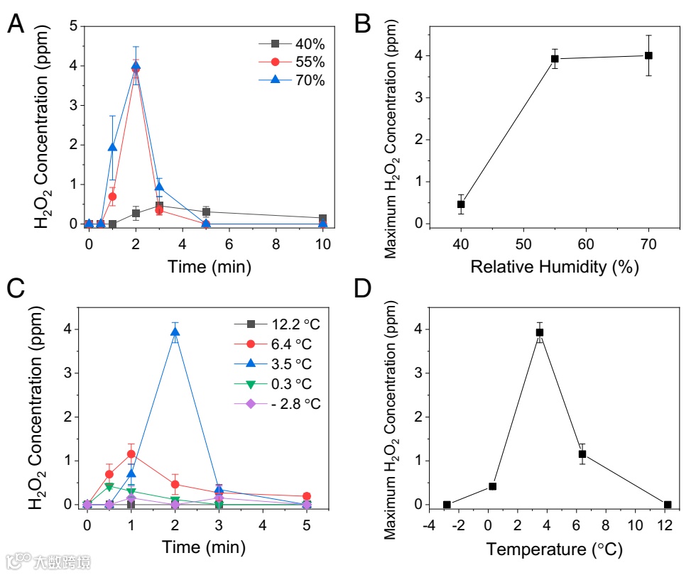 最后,研究者还研究了环境湿度和温度对冷凝水中H2O2浓度的影响。发现当相对湿度在40%时,液滴的生长要比55%和70%慢,H2O2浓度达到最大的时间推迟到了3分钟,湿度大于55%后,对H2O2生成没有影响;当相对湿度从40%增加到55%后,H2O2的最大浓度也从0.5 ppm提高到了4 ppm。