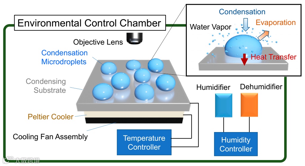 研究者首先建立了一个温度和湿度可控的环境,利用Peltier制冷器形成了一个温度可控的冷却面,以Si片为冷凝水接受面,接受面顶部安装有光学显微镜进行实时成像,之所以选择Si片是因为单晶硅电导率低,对H2O2的影响最小,而且导热性高,可以促进水蒸气的冷凝。