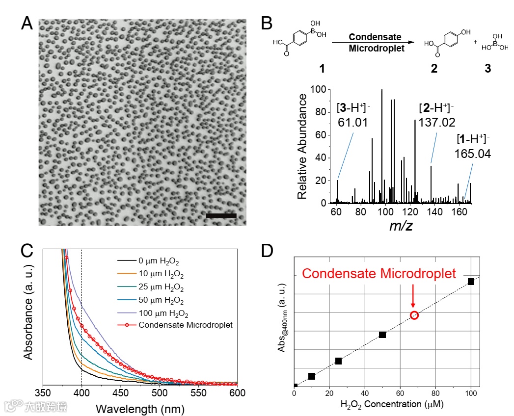 图2. (A)在硅晶片表面上形成的小水滴;(B)羧基苯硼酸与生成的H2O2反应生成了4-羟基苯甲酸和硼酸;(C)H2O2水溶液的吸收光谱;(D)计算H2O2浓度的校准曲线。