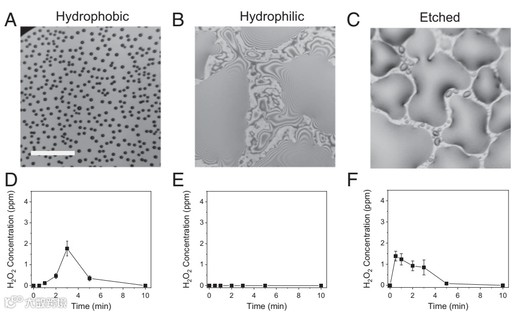 研究者认为冷凝表面的物理性质可能会影响H2O2的浓度。他们在Si片表面进行了亲水、疏水和粗糙度处理,得到了三种不同类型的Si片。