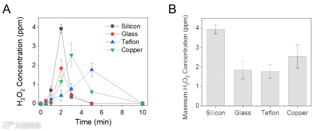 你以为只有Si片表面才能产生H2O2吗?错了,研究者又在玻璃、特氟龙和铜的表面进行了同样实验,发现在各种表面冷凝都能形成H2O2,只不过Si片上浓度最高罢了。而且,玻璃和铜的表面在冷凝约2分钟后H2O2浓度也达到了最高,特氟龙表面达到最高浓度的时间略有延长,为5分钟。