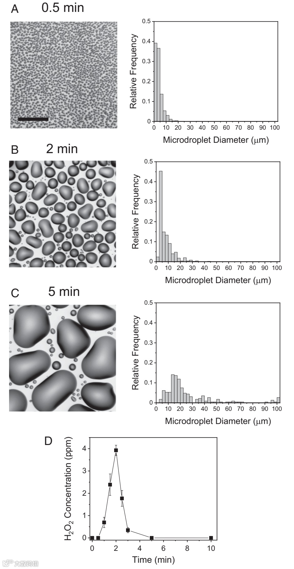 研究者在不同冷凝时间进行取样分析,发现随着时间的延长,小液滴的直径不断增大:在0.5分钟时,小液滴平均直径为4.0±2.7μm,此时H2O2浓度小于1.0 ppm;2分钟时,直径增加到7.7±5.7μm,H2O2浓度达到最大值, 3.9ppm;5分钟后,液滴直径生长到12.5μm,但是已经检测不到H2O2的存在,也就是说当液滴直径小于10μm才有利于的H2O2生成。