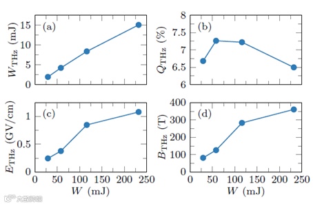 图4 中红外灯丝产生的太赫兹辐射的各种参数(a)太赫兹脉冲能量WTHz,(b)太赫兹转换效率QTHz,(c)估计的峰值电ETHz,以及(d)聚焦太赫兹脉冲的磁场BTHz,与3.9 µm两色激光脉冲的输入能量W间的关系。