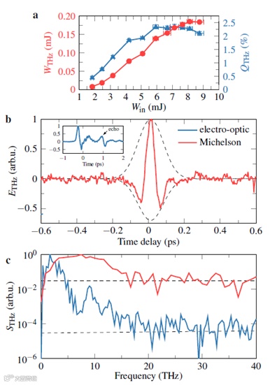 图6 3.9µm两色激光脉冲产生的太赫兹脉冲的能量、时间和频谱特性。(a)太赫兹能量WTHz和相应的太赫兹转换效率QTHz取决于输入激光能量Win。(b)通过电光采样(插图,蓝色)和迈克尔逊干涉仪(红色)测量的THz信号ETHz。(c)通过上述技术获得的太赫兹功率谱STHz(实线)以及每种技术的噪声水平(虚线)。
