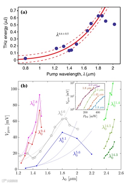 图3 激光波长下太赫兹能量的缩放比例(a)Clerici等人针对12种不同的泵浦波长(实心圆)测量的太赫兹能量。红色实线表示幂律拟合λ4.6±0.5以及65%的置信区间(红色虚线)。(b)热电探测器信号的波长依赖性,表明Nguyen等人在实验中获得了太赫兹能量。不同的点集对应于不同的OPA和输入脉冲能量。虚线曲线提供了λ拟合。灰色圆圈重复了Clerici等人的数据。
