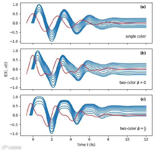 图1 通过双色激光脉冲诱导空气等离子体辐射太赫兹波的原理示意图。电子速度v(t)(蓝线)是在不同时刻释放的几个电子的电子速度,其接近驱动场E(t)的峰值(红线)。(a)单色激光场E(t)=A(t)cos(ω0t)。(b)和(c)双色激光场E(t)=A(t)cos(ω0t)+[A(t)/2]cos(2ω0t+φ),其中(b)φ=0且(c)φ=π/2。幅度A(t)=exp(-t2/τ02),其中τ0= 5fs。中心频率ω0对应于800nm波长。