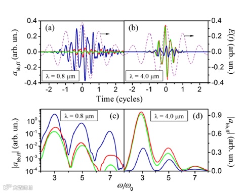 图2 不同激光波长下束缚电子和自由电子的辐射幅度比较。强度为110TW/cm2的激光脉冲(紫色虚线)的束缚态和自由电子(a)、(b)及其光谱(c)、(d)的时间分辨辐射幅度abb(蓝色)和aff(红色)。其中,(a)和(c)对应的波长为0.8μm,(b)和(d)为4µm。使用半经典模型对自由电子的计算结果以绿线给出。