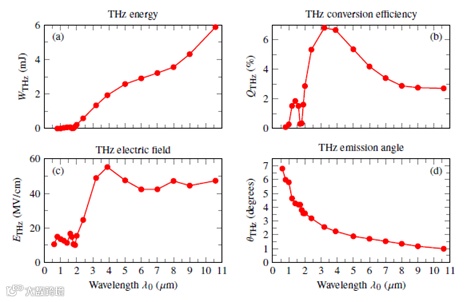 图5 各种THz参数对激光波长的依赖性(a)产生的THz脉冲WTHz的能量,(b)THz转换效率QTHz,(c)峰值THz电场ETHz,以及(d)THz发射角θTHz与波长的关系基本激光脉冲的λ0。