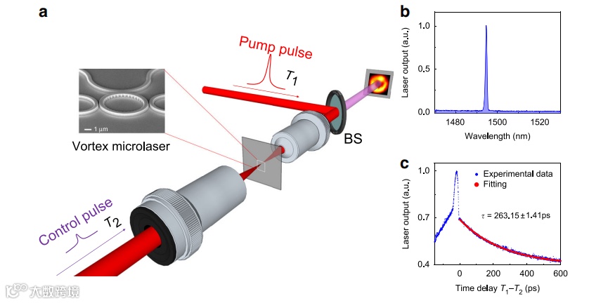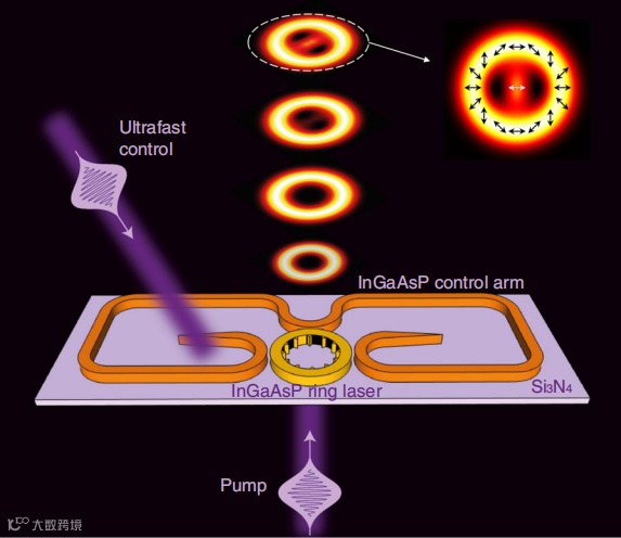 图1 分数轨道角动量(FOAM)的超快控制通过可调谐涡旋微激光。一个InGaAsP微激光器嵌入在硅氮化硅衬底中,并与外部控制臂耦合,两者都由超快脉冲泵浦,实现了所需的自旋轨道相互作用。通过控制脉冲和泵浦脉冲之间的时间延迟,激光发射的分数轨道角动量可以以皮秒分辨率进行时间调制。插图显示了空间变化的电场分布,显示了分数轨道角动量发射的矢量性质。