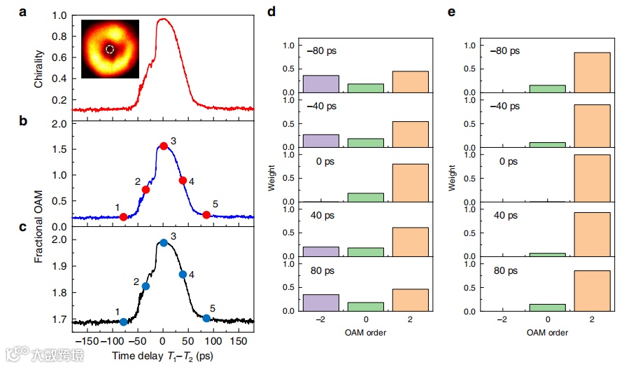 携带分数轨道角动量的光束的产生类似于同时产生至少两束不同振幅的共传播OAM光束,要依靠精心排列的桌面光学设置,包括一个非整数螺旋相位板,几何相位设计的J板,超表面,或空间光调制器。通过精细地调整两个不同的OAM分量之间的权重,可以得到所需的分数轨道角动量。例如,一种可重构的分步轨道角动量发射器最近已经被证明是基于“超光栅”,通过可控孔径改变照明区域。然而,在光通信和计算应用中,分数轨道角动量的高速控制和快速可重构性是一个挑战,因为现有的方法要么是静态的,要么是机械缓慢的。基于非共振非线性的超快控制提供了一种可行的途径;但是,这种方法对控制功率要求较高,开关效率较低。