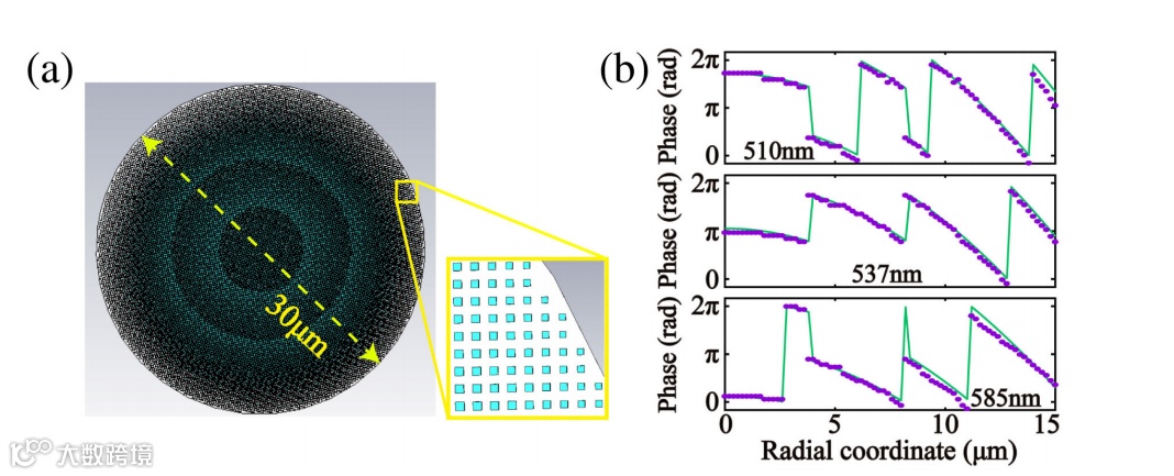 光学超振荡现象,发生在带限函数能够比其最高傅里叶分量振动快得多的区域,已经引起了大量的关注,并被证明在NA极限下的光学系统中提供非侵袭性的远场超分辨率图像。该方法可以有效地避免复杂的近场操作和特异性染料标记。超振荡焦点主要是由衍射光学元件、超表面等人工结构产生的经过特殊优化的相位和振幅分布的光的精细干涉产生的。然而,大多数报道的超振荡元件对入射波长的变化很敏感。2015年,提出了一种基于Pancharatnam Berry (PB)超表面的宽带超振荡结构,并在实验中得到了验证。所使用的纳米孔径可以提供整个可见波长的无色散相位剖面,并在不同波长下产生几乎相同光斑大小的亚衍射焦点。但在空气中传播时,由于不同的波长,焦平面会随着波长的变化而发生位移。为了校正轴向偏移,超振荡超表面滤光片和商用消色差透镜的组合被用于宽带超分辨率成像,但集成和小型化这样一个庞大的装置是非常困难的。利用固有物质色散来确定和计算不同波长的光响应。换句话说,一旦所用的材料被确定,就没有在不同波长分别调制相函数的自由度。