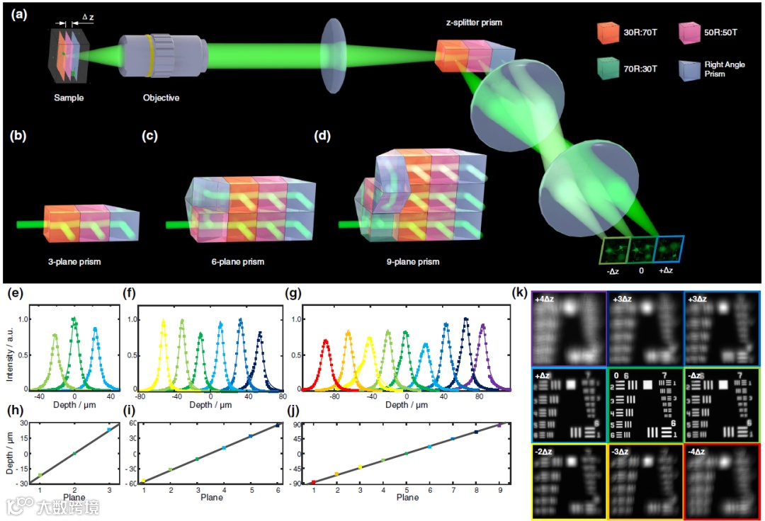 最近,来自美国波士顿大学(Boston University)的研究人员提出了一种多焦点成像策略,它基于一个简单的z-分光棱镜,它可以由现成的组件组装而成。z-分光器将探测光路分成一系列指向一台摄像机的多条路径,这样每个探测路径都共轭不同的焦平面。以这种方式,在单个照相机帧中同时成像样品中沿轴向分布的焦平面序列。利用图像采集的体积特性,研究人员进一步引入了一种新的扩展体积三维反褶积策略,以抑制远离焦的荧光背景,从而显著提高记录图像的对比度,使得系统具有准光学切片的能力。该技术基于标准的宽场显微镜,可以很容易地应用于除荧光之外的各种成像模式,例如相位对比度和暗场成像。由于它的简单,多功能性和性能,相信该系统将在生物医学成像中广泛应用。文章以“High-contrast multifocus microscopy with a single camera and z-splitter prism”发表在Optica上。(鲁强兵)