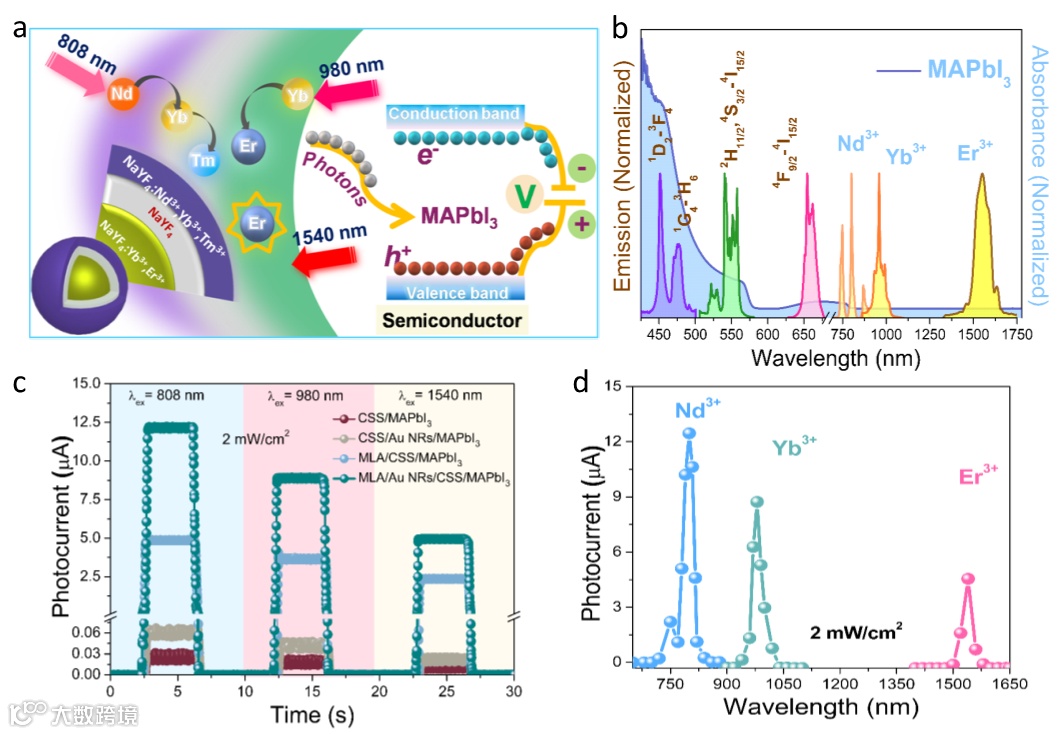 图3 (a)NIR PDs原理图。(b)钙钛矿MAPbI3层、Nd3+、Yb3+、Er3+的吸收光谱,以及CSS UCNCs的1D2→3F4、1G4→3H6、2H11/2,4S3/2→2I15/2、4F9/2→4I15/2的发射光谱图。(c)在功率密度为2 mW/cm2,分别在808 nm、980 nm以及1540 nm照射下,CSS/MAPbI3、Au NRs/MAPbI3、MLA/MAPbI3、MLA/Au NRs/MAPbI3 PDs的on-off光电流-时间的响应曲线。(d)MLA/Au NRs/MAPbI3 PDs在808 nm、980 nm以及1540 nm照射下的光电流响应。