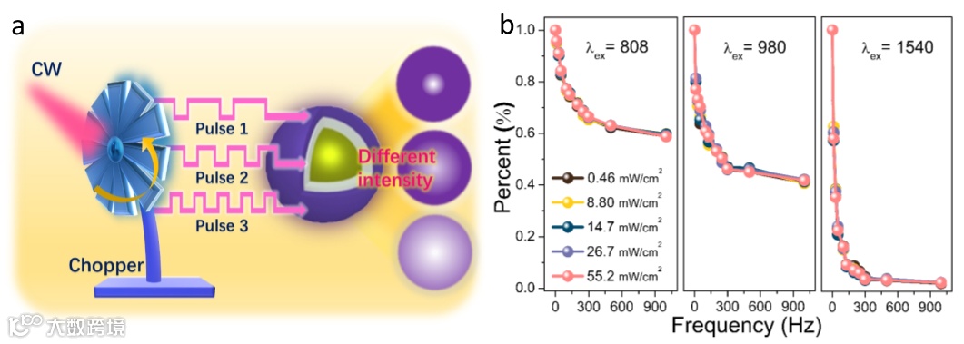 对于可多波段探测的NIR PDs来说,能够准确地分辨入射光的波长至关重要。每一个单独的上转换纳米颗粒由许多发光中心(Ln3+)耦合组成,整体构成一个动态的光学系统,这些发光中心受特定的光激发(如激发波长、激发强度和激发频率调制)可产生特异性响应。考虑到CSS UCNCs对不同的激发波长有不同的响应速度,基于光子上转换路径的不同,我们利用UCNCs对激发调制频率的响应,在对时间的傅里叶变换中,实现了分离不同激发波长的可能性。在相同功率密度的三种激发光照射下,UCL的强度均有着明显的降低,且强度随不同频率的入射光的下降速率的变化幅度差别很大,由此利用这种巨大的差异可区分入射光波长。值得注意的是,在较宽的功率密度范围内(0.46-55.2 mW/cm2),所有入射波长的变化趋势与激发光功率密度无关。
