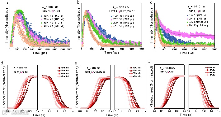 合成不同稀土离子掺杂比的CSS UCNCs,以及制备基于各种掺杂比例CSS UCNCs所集成的MLA/Au NRs/UCNCs/MAPbI3 PDs。调控稀土离子掺杂比例的策略可以在很大程度上改变UCL的荧光动力学,随着Nd3+、Yb3+、Er3+掺杂比例的增多,CSS UCNCs的荧光寿命逐渐缩短。这种寿命的缩短直接影响到基于UCNCs集成的PDs在光电流响应时间上的变化,包括光电流的上升和衰减时间,最高可缩短50%。