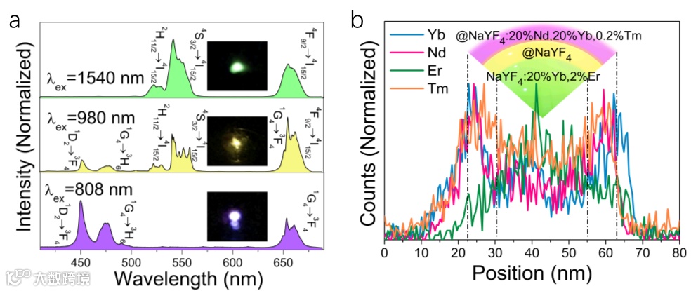 图1 (a)NaYF4: Yb3+, Er3+@NaYF4@NaYF4: Yb3+, Nd3+, Tm3+ UCNCs 分别在808 nm、980 nm和1540 nm的激发光照射下的光谱图,插图为UCNCs的可见光发射的照片。(b)对单个UCNCs中Yb、Nd、Er和Tm离子的元素含量线扫描图