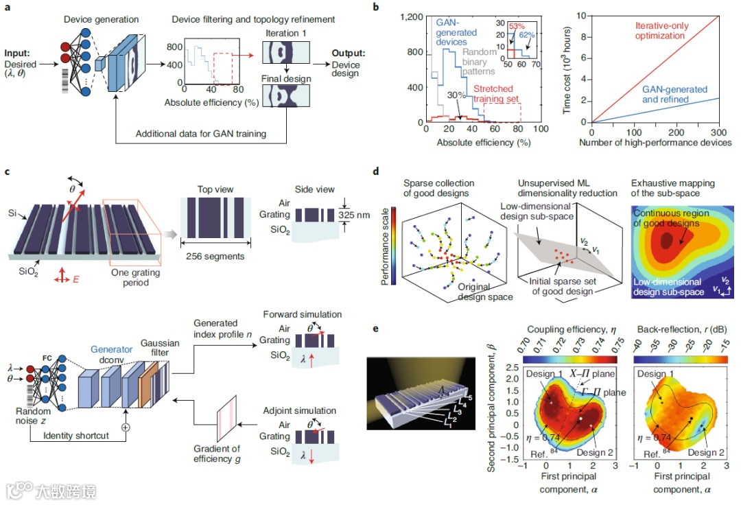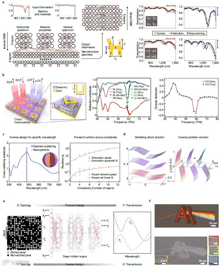 光子学结构设计是光电子器件和系统设计的核心。许多人工设计的光子学结构,比如超构材料、光子晶体、等离激元纳米结构等,已经在高速光通信、高灵敏度传感和高效能源收集及转换中得到了广泛应用。然而,在该领域中通用的设计方法是基于简化的物理解析模型及相关经验完成的。尽管这种方法可以得到所需的光学响应,但其从本质上说是基于错误的反复尝试(trial-and-error)并且通常依赖于耗时的数值计算来完成,从而导致效率很低并且很可能错过最佳的设计参数。