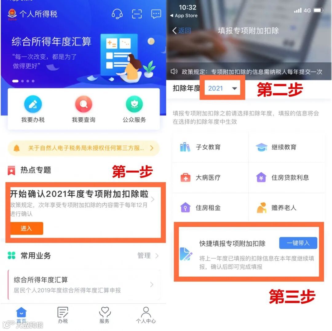 打开个人所得税APP-首页-“专项附加扣除填报”-选择“扣除年度”-“一键带入”;如下图所示: