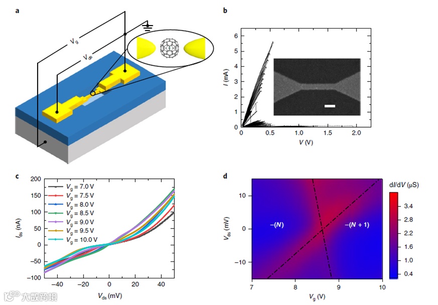 图5. Gd @ C82 单分子器件中的单电子输运。(a) 器件结构示意图,其中一个笼状的单分子处于断裂尖端处。(b) 负反馈电迁移中电流 - 电压曲线,插图是未断裂前的电极,白色的标尺为 100 nm。(c) 在不同栅极电压下,源 - 漏的电流-电压曲线。(d) 源 - 漏微分电导对栅极电压和源 - 漏电压的强度图。