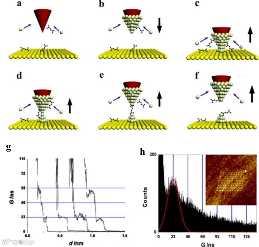 首先在导电衬底上沉积要研究的分子 (图 3a),通常是单层薄膜样品。接着会给 SPM 针尖蒸镀一层 Au 用来作为导电的电极。导电 SPM 针尖下降到接触到衬底 (图 3b),然后再缓慢抬起 (图 3c, 3d)。在抬起过程中,记录针尖和衬底之间电导随针尖抬起距离的改变。这里注意到,针尖接触衬底时,其尖端实际上已经钝化,针尖会在抬起过程会重新出现尖锐化,引起周围单分子吸附到针尖尖端上。针尖与单个分子相连,形成单分子结 (图 3e)。如果进一步抬起针尖,分子结便会破裂,电导出现急剧下降至几乎为零 (图 3f)。